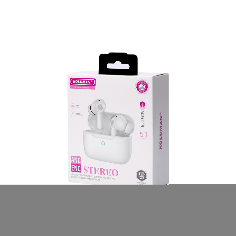 محصول جدید از کمپانی کلومن ( KOLUMAN) با نام ( K-TW29) معرفی شد . این محصول از سری هدفون های بی سیم کمپانی کلومن است که با توجه به امکانات و طراحی مینیمال خود مورد توجه قرار گرفت . این ایرپاد در کنار کیفیت ساخت فوقالعاده بالای خود، به بلوتوث نسخه 5.1 مجهز شده است تا شاهد سرعت بسیار بالای آن در زمینهی برقراری اتصال آن از طریق بلوتوث باشیم . فناوری کنترل لمسی برای پاسخگویی به تماس و همچنین پخش و توقف موسیقی بر روی گوشی های این هدفون قرار گرفته است . از این هدفون بی سیم برای استفاده از دستیار صوتی نیز میتوان استفاده کرد . باتری به کار رفته در این هدفون بی سیم از نوع لیتیوم پلیمری ست .این هدفون قابلیت کم و زیاد کردن صدای موسیقی از روی گوشی ها را برایتان فراهم میکند . جذابترین قابلیت این کالا دارا بودن NOISE CANCELLING یا به اختصار ANC میباشد این قابلیت باعث کاهش صدای محیط اطراف میشود و شفافیت صدا هنگام گوش دادن به موسیقی و مکالمه در بالاترین حالت خود خواهد بود