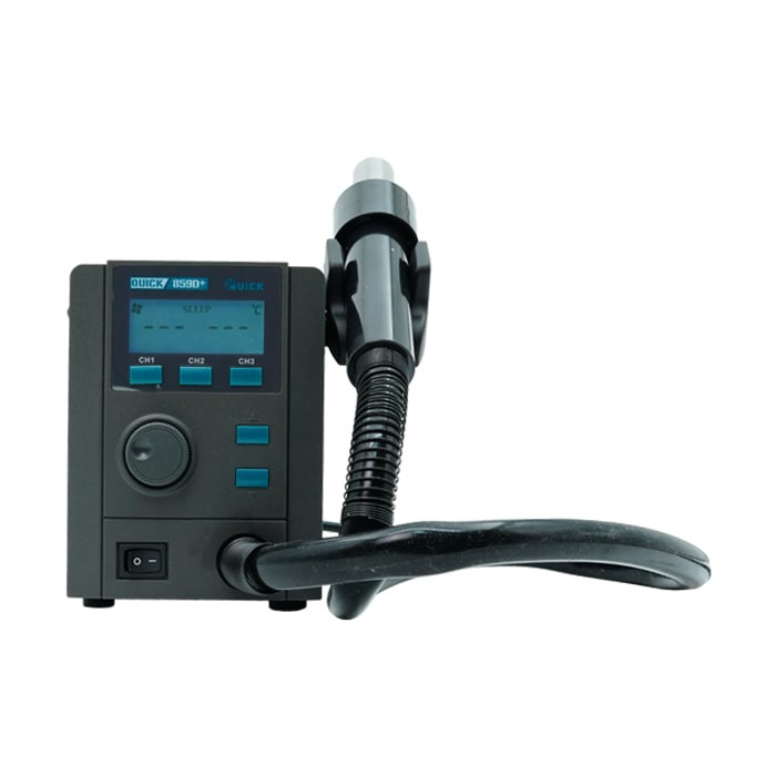 هیتر کوییک QUICK +859D – یکی از جدیدترین محصولات معرفی شده سال 2022 برند معتبر Quick است. این محصول دارای ویژگی و قابلیتهای جدید و بروزرسانی شده نسبت به مدلهای قدیمیتر این برند میباشد و کماکان شاهد پیشتازی برند و کمپانی بزرگ کوییک در تولید انواع تجهیزات به خصوص هیتر و هویههای تعمیرات موبایل هستیم. هیتر 859 دی پلاس دارای سیستم خواب هوشمند است و موجب صرفه جویی در مصرف انرژی و طول عمر بالای عناصر گرمایشی میشود. صفحه نمایش این محصول از نوع ال سی دی برای نمایش میزان حجم خروجی هوا (باد) و درجه حرارت دستگاه میباشد.