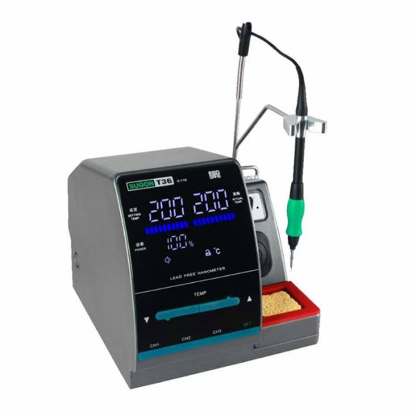 هویه سوگون SUGON T36 دارای یک عدد نوک JBC میباشد که دارای قدرت و توان خاصی به اندازه 85 وات است که تنها به حدود 2 ثانیه زمان برای رسیدن به دمای مورد نظر نیاز دارد. این هویه دارای سه کانال ذخیره سازی دما میباشد که برای انجام کار های مختلف کاربرد دارد. این هویه از دسته C115 و نوک JBC پشتیبانی میکند