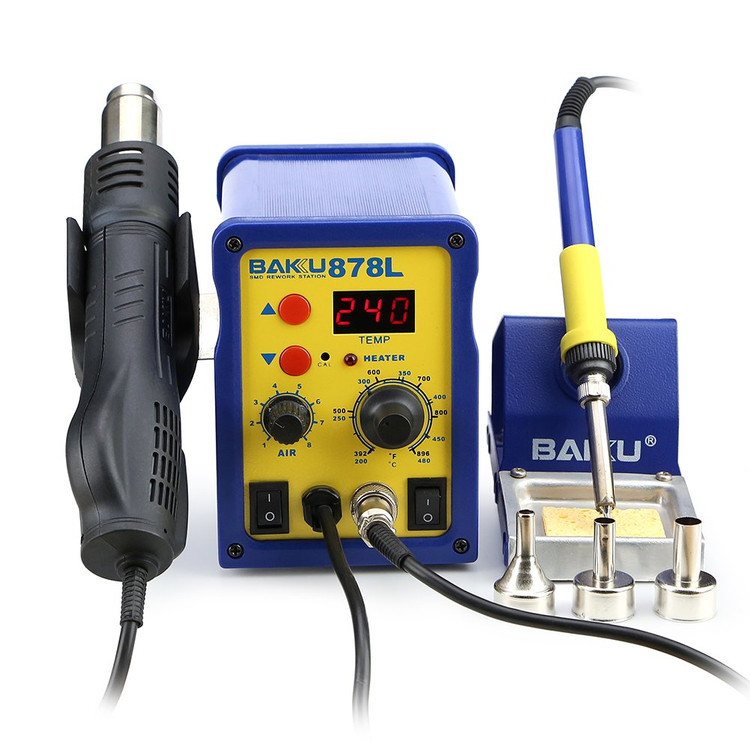 هیتر و هویه باکو 878L – این محصول برای تعمیرات بردهای الکترونیکی به ویژه بردهای دارای قطعات SMD مورد استفاده قرار میگیرد. هیتر و هویه یکی از مهمترین ابزارها برای تعمیرات گوشی موبایل است، که از آن برای جایگزین کردن قطعات معیوب با سالم در بردهای اصلی گوشی استفاده میکنند. این هیتر دارای یک فن داخلی است که برای تولید باد میباشد. در قسمت دستهی دستگاه، یک المنت قرار دارد که باد سرد را به باد گرم تبدیل میکند. دما و شدت باد هیتر قابل تنظیم است.