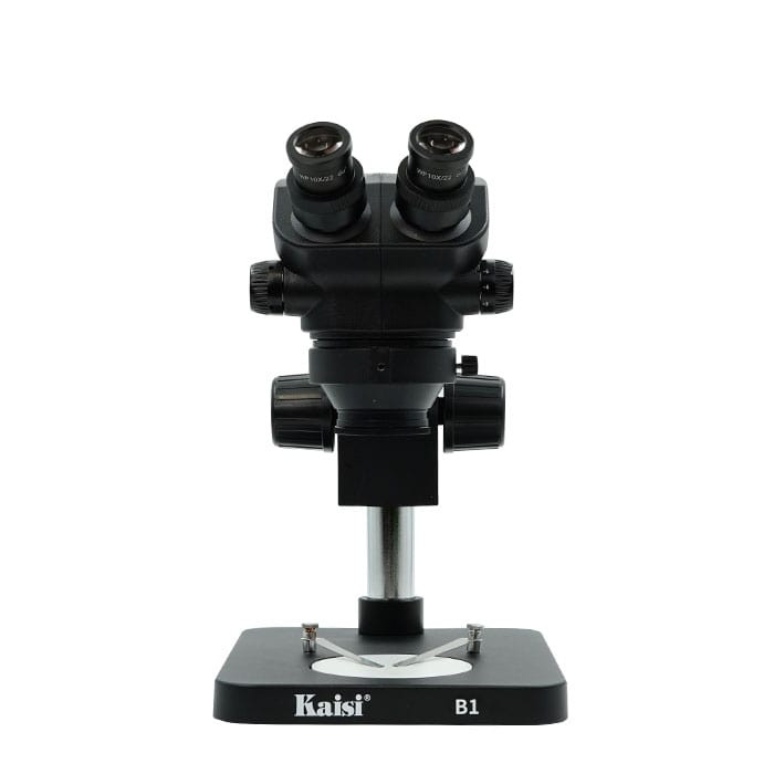 این لوپ آنالوگ، از دو چشمی با لنز WF 10x20mm بهره میبرد و دارای زوم 7X- 50X است. همچنین میتوانید قدرت زوم این لوپ را با عوض کردن لنز آن افزایش دهید. فاصله کاری این لوپ 10 سانتیمتر است که امکان افزایش آن تا 20 سانتیمتر نیز وجود دارد. طراحی لوپ دو چشم آنالوگ Kaisi 7050-B1 به این شکل است که روی یک پایه فلزی در محور عمودی جا به جا میشود و با توجه به نیاز خود میتوانید فاصله تا میزکار را تنظیم کنید. همچنین قابلیت چرخش 360 درجه و تنظیم فاصله بین چشمیها از دیگر ویژگیهای حرکتی این لوپ پیشرفته است. گفتنی است امکان نصب لنز همسانساز برای لوپ آنالوگ مدل 7050-B1 نیز مهیا است. فراموش نکنید که بهترین نوع، لنزهای همسان ساز 0.5X است. در ضمن زیر چشمی این لوپ دو نگه دارنده برد نیز تعبیه شده است که در حین کار بتوانید آن را فیکس کرده و به راحتی به کار خود ادامه دهید.