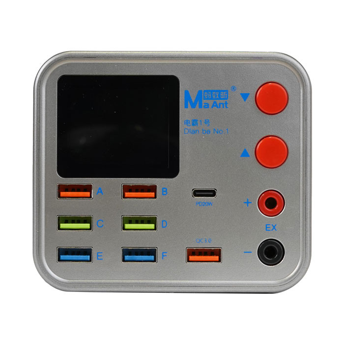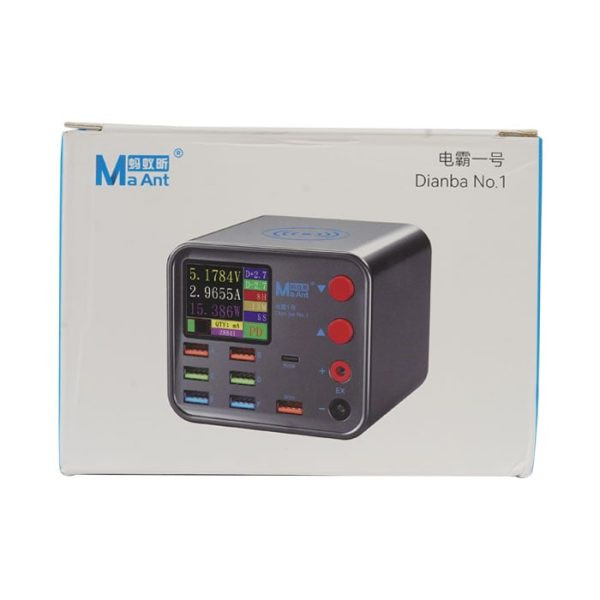 یکی دیگر از امکانات این دستگاه، مانیتور بزرگ 1.8 اینچی LED رنگی آن است که بصورت دقیق اطلاعات را نمایش میدهد. شما میتوانید وضعیت شارژ شدن دستگاه متصل به این مولتی شارژر را روی صفحه نمایش مشاهده کنید. بد نیست بدانید مهمترین قابلیت دستگاه مولتی شارژر maant dianba داشتن یک پورت شارژ سریع PD20W+QC3.0 است. گفتنی است چیپهای کنترل کننده جریان الکتریکی این تستر فست شارژ میتواند ضمن جلوگیری از نوسانات ولتاژ، ولتاژبالا، از مدار الکتریکی، اتصال کوتاه، تخلیه الکتریکی زیاد، قطع جریان الکتریکی از باتری دستگاههای متصل به خود محافظت نماید. یکی دیگر از امکانات ویژه این دستگاه قابلیت شارژ وایرلس بصورت شارژ سریع با توان 10 وات است که شما میتوانید بصورت همزمان 8 دستگاه را از طریق پورتهای شارژ و کابل و یک دستگاه را نیز از طریق وایرلس شارژ به این مولتی شارژر وصل نمایید.