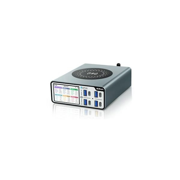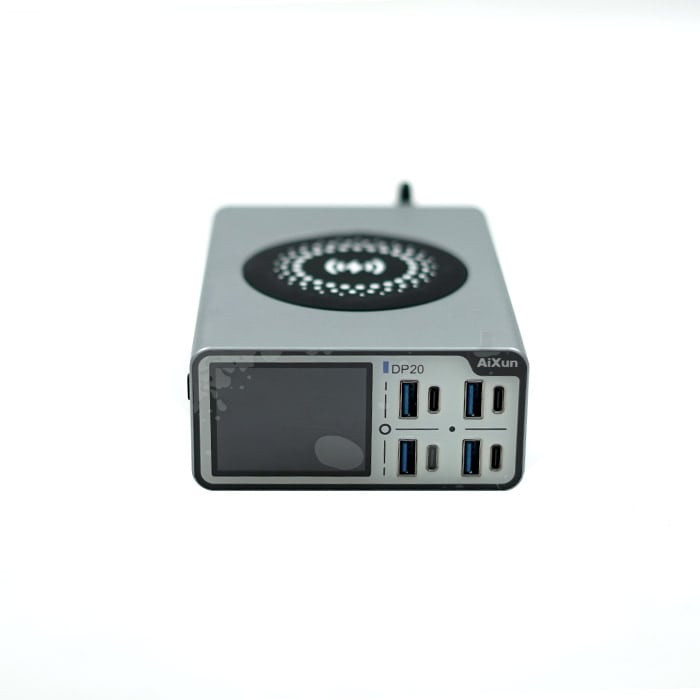 مولتی شارژر AiXun DP20 – از جدیدترین محصولات برند مطرح آکسون است. یکی از ابزارهای اساسی و مورد نیاز تعمیرکاران مولتی شارژر میباشد که برای تست و شارژ کردن چند گوشی موبایل به صورت همزمان کاربرد دارد. این مولتی شارژر دارای چهار خروجی USB است و دارای شارژ سریع نیز میباشد، همچنین چهار پورت تایپ سی را پشتیبانی میکند. یک نمایشگر دیجیتالی روی محصول قرار دارد که تمامی تنظیمات و اطلاعات مربوط به دستگاه را نمایش میدهد. از دیگر ویژگیهای مهم این محصول توانایی شارژ کردن بی سیم است که میتوانید دستگاه خود را به وسیله شارژر وایرلس شارژ کنید. اگر برای تعمیرات خود نیاز به یک مولتی شارژر حرفهای دارید، این محصول نیاز شما را از یک ابزار کارآمد برطرف میکند.