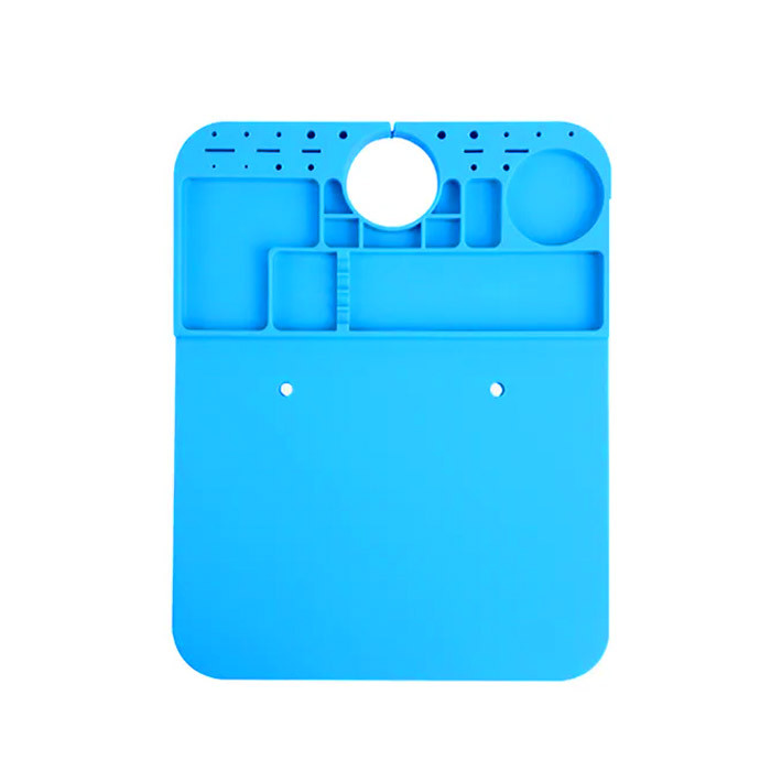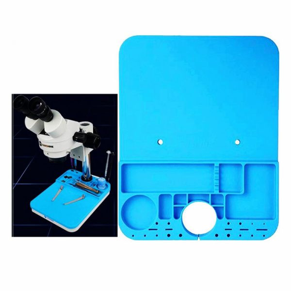 پد نسوز RELIFE RL-004M – مناسب قرارگیری بر روی پایه لوپ میباشد. این محصول دارای بخش های مختلف برای قرارگیری ابزارآلات و قطعات جداشده در حین تعمیرات است که باعث مرتب شدن میز تعمیرکار و سهولت در انجام کار میشود. طریقه نصب پد زیر لوپ بسیار ساده و بدون بازکردن و جداکردن قطعات فقط با فشار دست پد روی پایه دستگاه شما نصب شده و به راحتی جدا میشود.قست پشتی این پد با سوراخهای ریز پوشانده شده که باعث ضدلغزش شدن آن است. جنس سیلیکون این محصول نرم و ضد استاتیک است و تا دمای 500 درجه سانتی گراد مقاومت دارد.