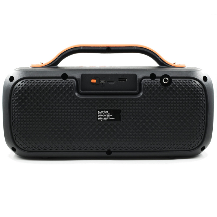 ورودی شارژ اسپیکر بلوتوثی SUNRISE Mini Box 50 از نوع Type c و بلوتوث این اسپیکر قابلحمل ورژن 5 است. این دستگاه با استفاده از RAM ،USB و بلوتوث و AUX قابل استفاده است و شما همکاران گرامی برای خرید اسپیکر شارژی سانرایز Mini Box 50 میتوانید از وبسایت ما اقدام کنید.