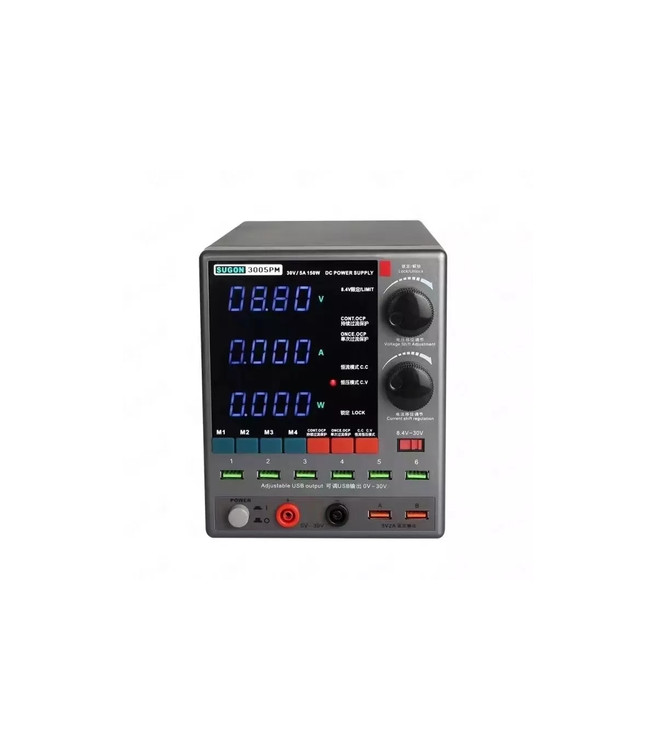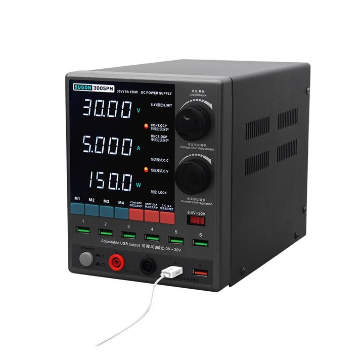 منبع تغذیه SUGON 3005PM – یک منبع تغذیه قدرتمند دیجیتال با ولتاژ 30 ولتی و جریان 5 آمپری است. این محصول دارای نمایشگر دیجیتال بوده و دارای کنترل کننده ولتاژ و جریان میباشد. از دیگر ویژگیهای این منبع میتوان به قابلیت محافظت در برابر اضافه بار و اضافه جریان اشاره کرد، همچنین در این محصول پورت خروجی USB بکار رفته است.