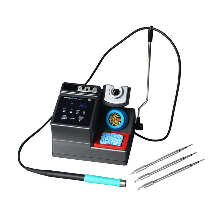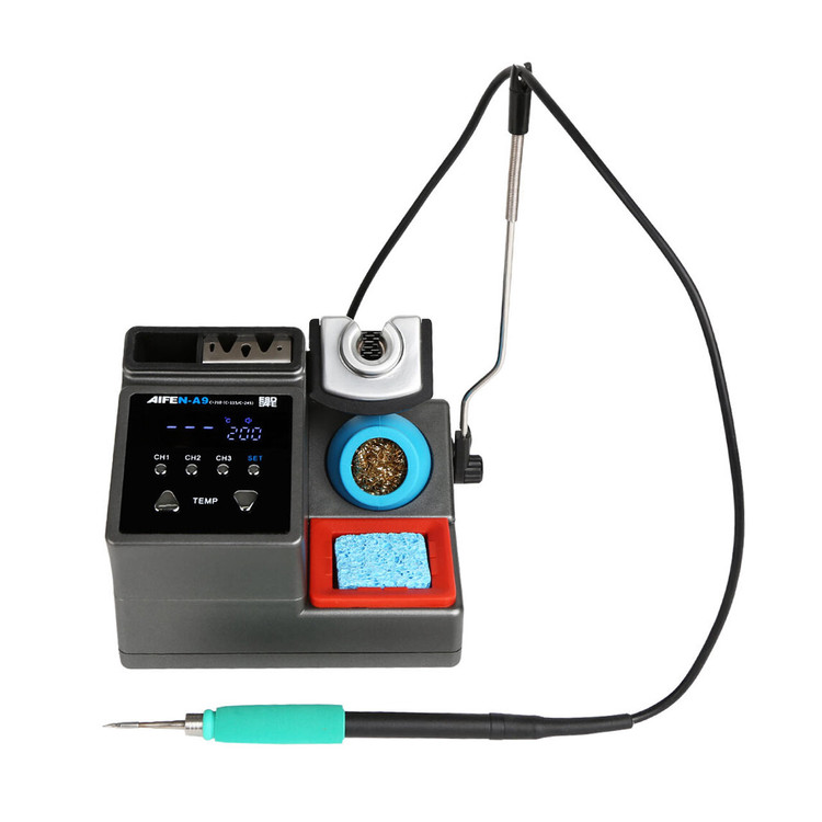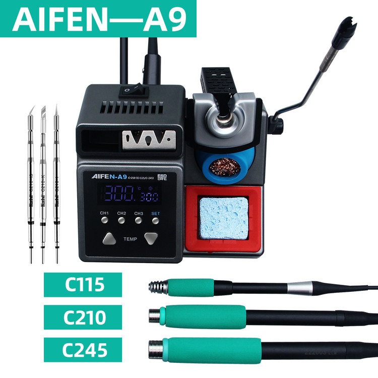 هویه AIFEN N-A9– هویه دیجیتالی دارای 3 کانال برای ذخیره سازی دما است و از سه دسته T115/T210/T245 پشتیبانی میکند. این هویه دارای 4 حالت تنظیم دما (0، 150، 180، 200) میباشد. همچنین هویه A9 از توان 120 واتی برخوردار است و دارای یک دسته C210 است. بدون استفاده از انبردست یا سایر ابزارهای کمکی، به سرعت نوکهای هویه لحیم کاری با دمای بالا را در محل کار تعویض کنید. این دستگاه دارای چند نوع حالت است مدلهای حالت I، نوع IS و نوع K میتوانند نیازهای کاری متفاوت شما را برآورده کنند. این دستگاه با طراحی ارگونومیک با صفحه نمایش LCD و دارای دکمههایی برای تنظیم دما و تنظیم عملکرد برای راحتی بیشتر است . دستگیره در صورت عدم استفاده وارد خواب خودکار میشود تا طول عمر هسته گرمایش را افزایش دهد، شما میتوانید دسته را بردارید تا فوراً تا دمای تنظیم شده گرم شود.