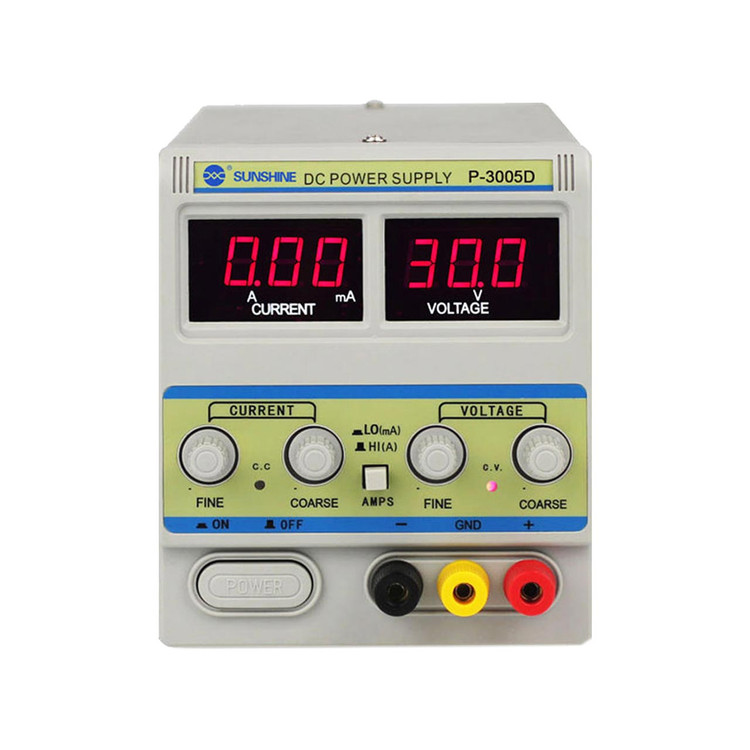 عموما به دلیل کارایی زیاد منبع تغذیه، تمامی تعمیرکاران به این دستگاه تعمیرات موبایل نیاز دارند. منبع تغذیه 5آمپر سانشاین Sunshine P-3005D برای تشخیص جریان کشی در گوشیهای موبایل مورد استفاده قرار میگیرد. بدنه با کیفیت و مستحکم آن و همچنین دقت زیاد منبع تغذیه Sunshine P-3005D به تعمیرکاران این اجازه را میدهد تا تشخیص دقیقی در مورد مشکل گوشی داشته باشند. این منبع تغذیه شرکت سانشاین به برق شهری 220 ولت متصل میشود. منبع تغذیه 5آمپر Sunshine P-3005D پس از اتصال به گوشی موبایل سه شکل واکنش از خود نشان میده و تعمیرکاران موبایل با توجه به این موضوع به تشخصیص و رفع خرابی گوشی یا تبلت میپردازند. 1- در حالتی که جریانی در گوشی یا تبلت وجود ندارد. 2- جریان زیر 0.10 آمپر است. 3- حالتی که آمپر بسیار بالاست. منبع تغذیه 5آمپر Sunshine P-3005D قابلیت تنظیم دقیق دستی ولتاژ 0 تا 30 ولت و 0 تا 5 آمپر است. همچنین این دستگاه دارای فرکانس درونی 50/60Hz و دو صفحه نمایش دیجیتال است.