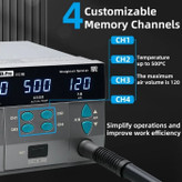 حجم هوای این محصول بین 1 تا 120 و دما نیز بین 100 تا 500 درجه سانتی گراد، قابل دستکاری و کنترل است. به لطف هسته گرمایشی این محصول، سرعت گرم شدن و تغییر میزان حجم هوا دستگاه در کسری از ثانیه انجام میشود. روی دستگاه نمایشگر LED وجود دارد که امکان نظارت و کنترل متغیرها را برای تعمیرکار فراهم میکند. برای این دستگاه هفت عدد سری تعبیه شده است که میتواند برای گرمایش محلهای حساس برد استفاده شود.