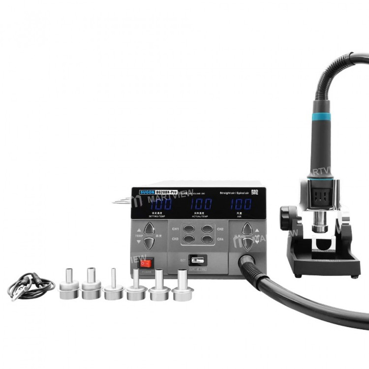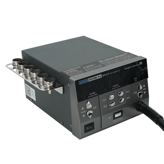 هیتر Sugon 8620DX PRO – جدیدترین هیتر برند Sugon در سال 2022 با بهترین کیفیت وارد بازار شد. هیتر جدید سوگان یکی از بهترین هیتر های حال حاضر هست که با جزئیات بسیار حرفه ای و دقیق طراحی شده و بسیار خوش ساخت میباشد. یکی از تغییراتی که در این دستگاه قابل مشاهده است، قسمت استند و پایه دسته هیتر میباشد که متحرک شده و قابلیت تغییر حالت دارد که به راحتی میتوانید آن را تنظیم کنید. همچنین دارای 4 کانال برای ذخیره سازی دما است که میتوانید بر روی هر کدام به صورت جداگانه دمای مورد نیاز و حجم باد خروجی را تنظیم و ذخیره کنید.