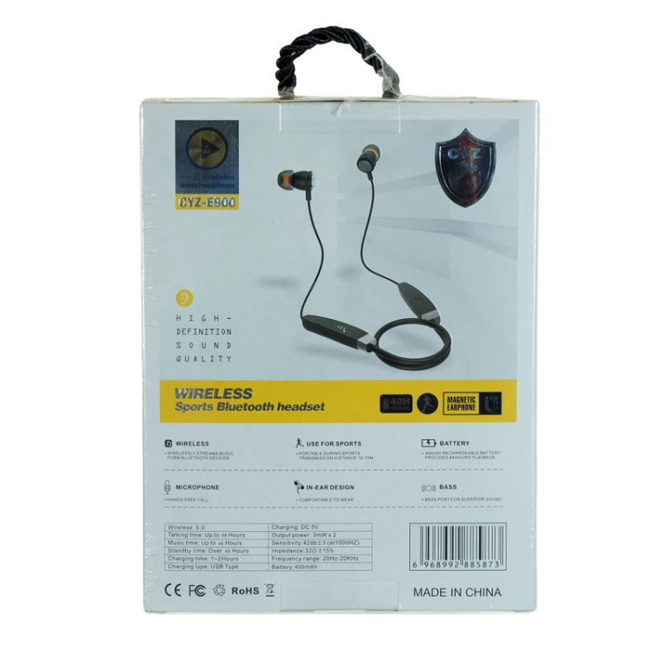 هندزفری بلوتوثی CYZ مدل (E900) دارای دو گوشی ایرفون است که با سیم به قسمت گردنی متصل شده است. در قسمت پشت این گوشیها آهنربایی تعبیه شده که در مواقع عدم استفاده از هندزفری میتوان این دو را بهم متصل کرد. این ایرفون دارای میکروفون نیز است که روی بدنه آن قرار گرفته و میتوان بهوسیله آن به مکالمه نیز پرداخت. باتری قدرتمند 400 میلیآمپرساعتی بهکار برده شده در این هندزفری بلوتوثی میتواند بیش از 48 ساعت پاسخگوی پخش موسیقی و مکالمه باشد. از این هندزفری بلوتوثی در هنگام ورزش نیز میتوان استفاده کرد، برد بلوتوث این هندزفری بلوتوثی E900 مابین 10 تا 15 متر است.این هندزفری مجهز به فناوری نویز کنسلینگ است که باعث افزایش کیفیت صدای در حال پخش میشود. نگهدارنده گردنی این محصول بسیار منعطف و استفاده از آن بسیار لذتبخش است.