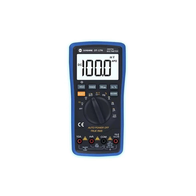 مولتی متر تعمیرات موبایل را می توان از اساسی ترین ابزارهای تعمیراتی دانست که استفاده گسترده ای در صنایع مختلف از جمله الکترونیک و تعمیرات موبایل دارد. مولتی متر دیجیتال sunshine dt-17n یکی از بهترین مولتی مترهای دیجیتال برای تعمیرات موبایل است. این مولتی متر خوب شرکت سانشاین دارای دقت بالا و توانایی اندازهگیری چند کمیت را دارد. البته که کیفیت مولتی متر این شرکت معروف را نباید نادیده گرفت. کاربرد مولتی متر دیجیتال سانشاین مدل sunshine dt-17n برای اندازه گیری چهار پارامتر اصلی اهم، ولت، آمپر و درجه حرارت قطعات الکتریکی است. پارامتر درجه حرارت نیز هنگام تست و کالیبره کردن هیتر بسیار موثر و کارآمد است. این مولتی متر ضریب خطای کم در محدوده اندازهگیری های مختلف دارد. (محدوده اندازه گیری مقاومت 600 مگا اهم – 60 اهم) تغذیه مولتی متر سانشاین dt-17n توسط باتری کتابی انجام می شود و براحتی قابل تعویض است. نور LED صفحه نمایش این دستگاه مولتی متر تا 15 ثانیه توان روشن ماندن را دارد که بصورت خودکار خاموش می شود. اندازه 21 میلیمتری مانیتور این مولتی متر دیجیتال سانشاین باعث دید بهتر و خوانایی خوب اعداد می شود. از دیگر ویژگیهای مولتی متر سانشاین dt17N می توان به موارد زیر نیز اشاره کرد: دارای ولتاژ اندازه گیری جریان(DC) دی سی 1000 وات و جریان (AC) ای سی 700 وات قابلیت بروزرسانی اندازه گیری و نمایش آن در هر 3 ثانیه دارای صفحه نمایش ال سی دی با قابلیت نمایش اعداد 4 رقمی دکمه HOLD برای ذخیره سازی مقادیر اندازهگیری شده سیگنال صوتی برای تست پیوستگی الکتریکی دارای الارم باتری در زمان کم بودن شارژ باتری مولتی متر