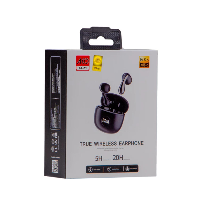 هندزفری بلوتوثی آکو مدل At-21 از نوع دو گوشی بوده و مطابق با استاندارد های سلامتی ساخته شده و کاملا ارگونومیک می باشد.نسخه بلوتوث نسخه این هندزفری 5.3 می باشد. میکروفون با کیفیت یکی دیگر از نکات قابل توجه در مورد این هندزفری است که این هنذزفری با داشتن میکروفون فوق العاده قابلیت مکالمه با شفافیت بالا را در اختیار شما قرار میدهد. با استفاده از پورت Type-C تعبیه شده بر روی بدنه آن، می توانید آن را شارژ نموده و کارایی حدود 5 ساعت را از آن انتظار داشت . باتری استفاده شده در این هندزفری با ظرفیت کلی 250 میلی آمپر ساعت بوده و کیفیت و کارایی بالایی دارد.هر کدام از ایرباد های این محصول دارای ظرفیت باتری 30 میلی آمپر ساعتی هستند و بنا به نوع کاربری و میزان صدا، کارایی باتری آن نیز متفاوت خواهد بود. پاورکیس آن در ابعاد بسیار مناسب قرار داشته و از جنس پلاستیک فشرده با دوام مناسب ساخته شده است و در قسمت جلویی کیس یک صفحه نمایشگر تعبیه شده که میزان شارژ دستگاه را به شما نمایش میدهد. بادزهای استفاده شده در این هندزفری با شکلی بسیار شیک بوده و این طراحی بادز را بسیار خاص جلوه میدهد . چنانچه دستگاه شما نیز دارای بلوتوث همسان باشد علاوه بر اتصال پایدار و دریافت صدای با کیفیت تر، موجب کاهش مصرف باتری نیز می گردد. پس از برقراری اتصال شعاع تحت پوشش این هندزفری حدود 10 متر است.